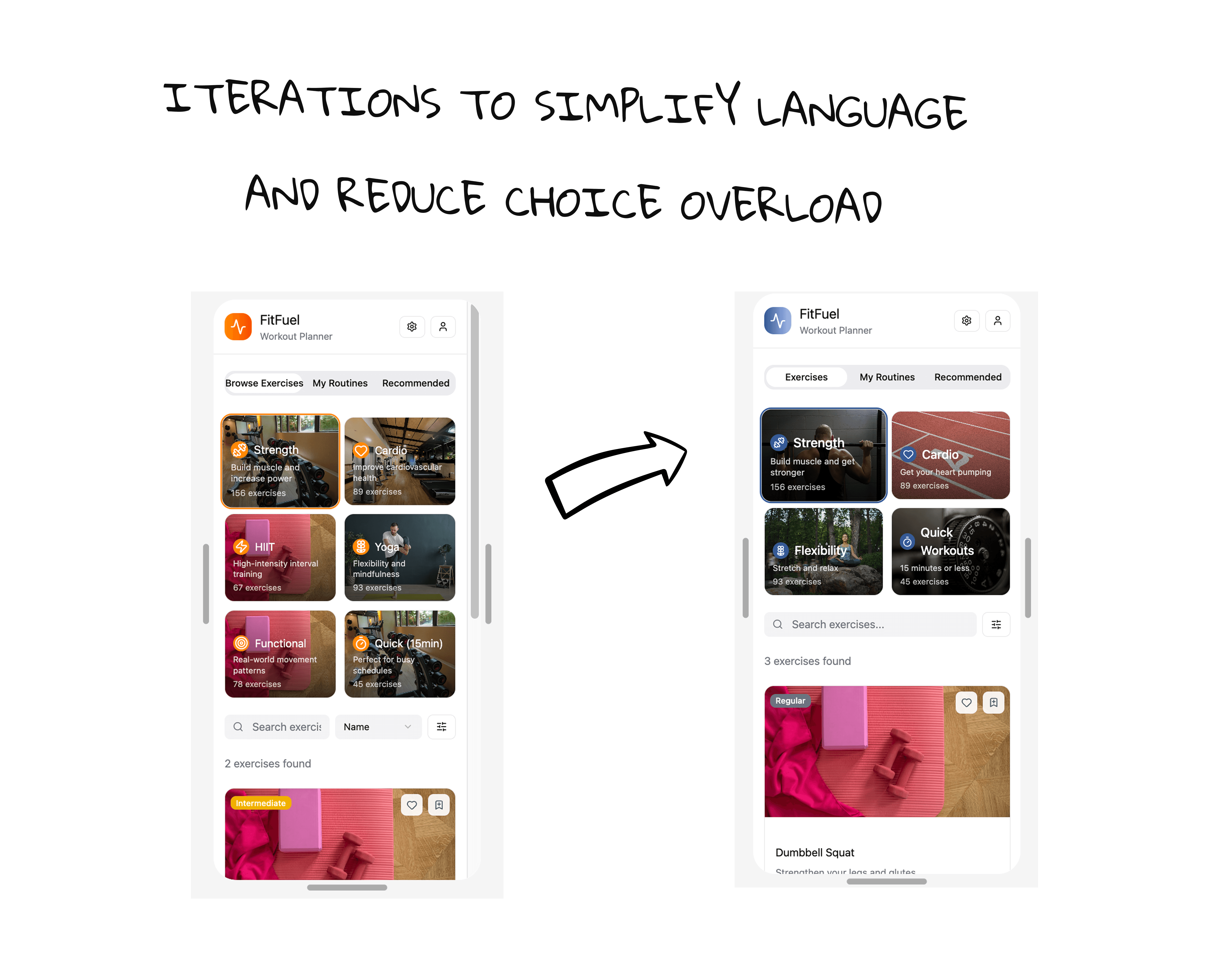 Early testing revealed confusion around fitness terminology, which led me to iterate quickly on clearer, more approachable microcopy and visual hierarchy.